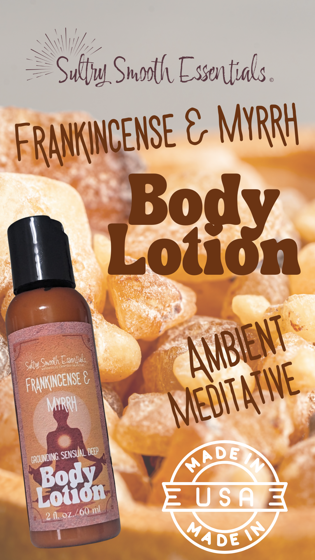 This wonderful aromatic lotion is made with Frankincense & Myrrh essential oils, grapeseed oil and handmade lotion base with broad spectrum preservative.